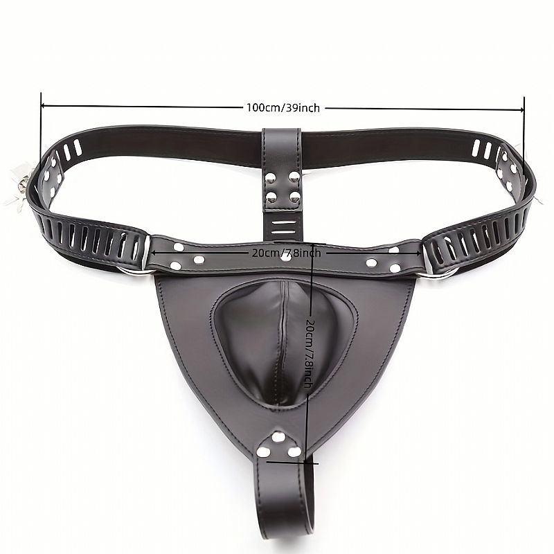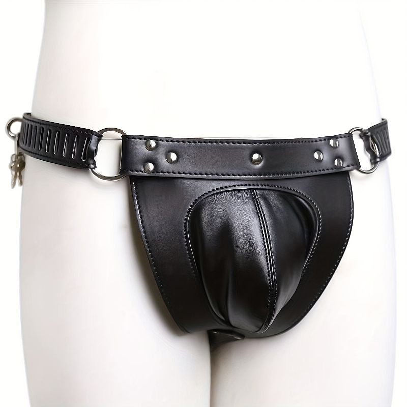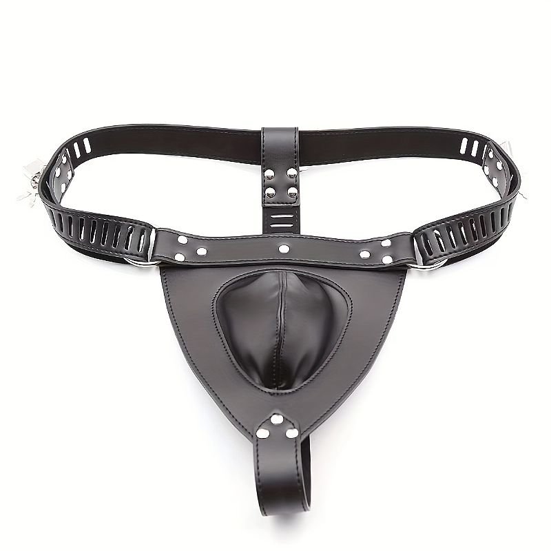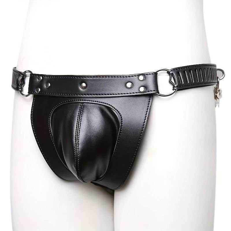 É um cinto de castidade masculino em couro com formato de cueca ajustável.