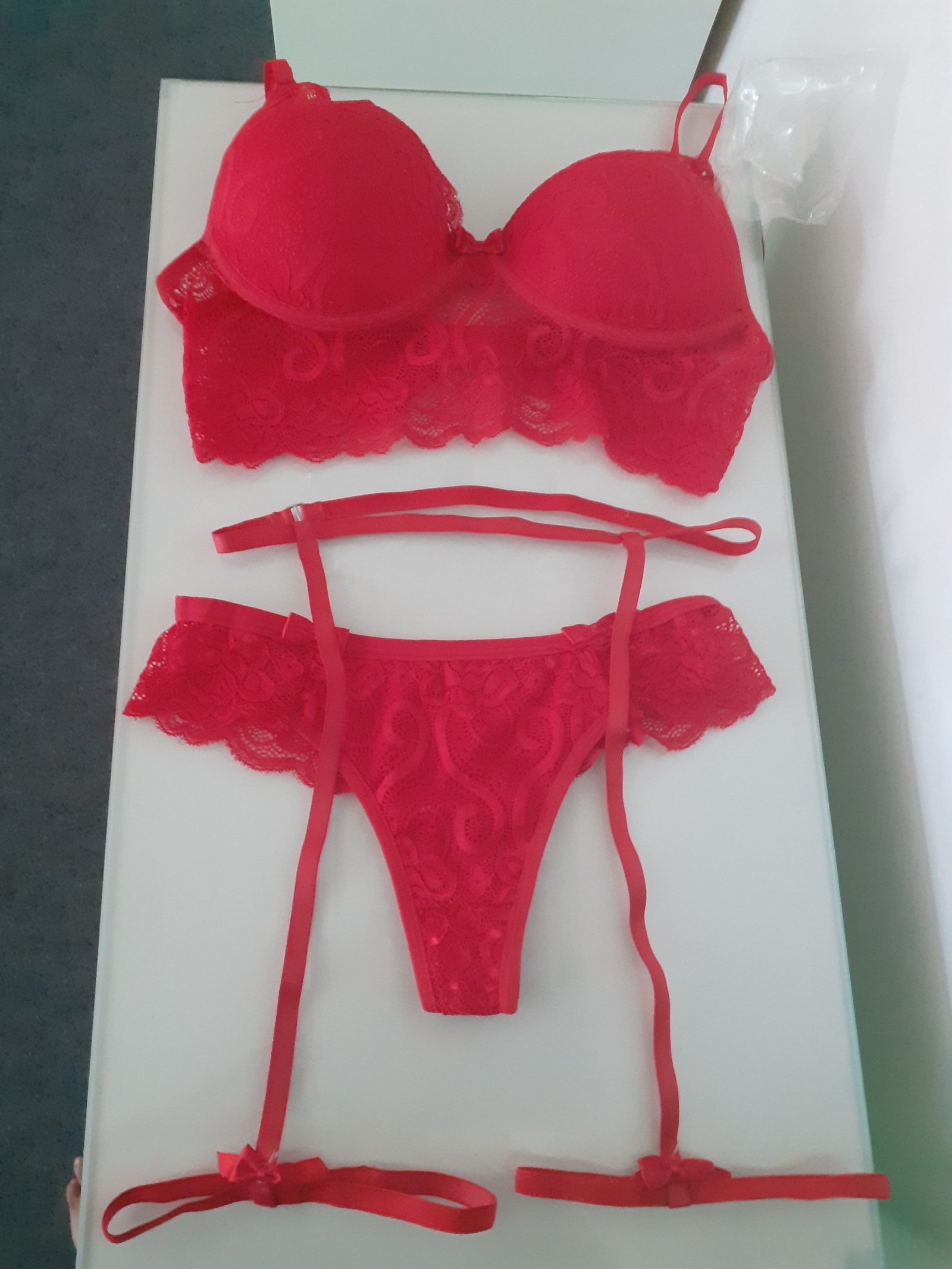 Conjunto Sexy cinta liga em renda e bojo. Calcinha Fio dental.