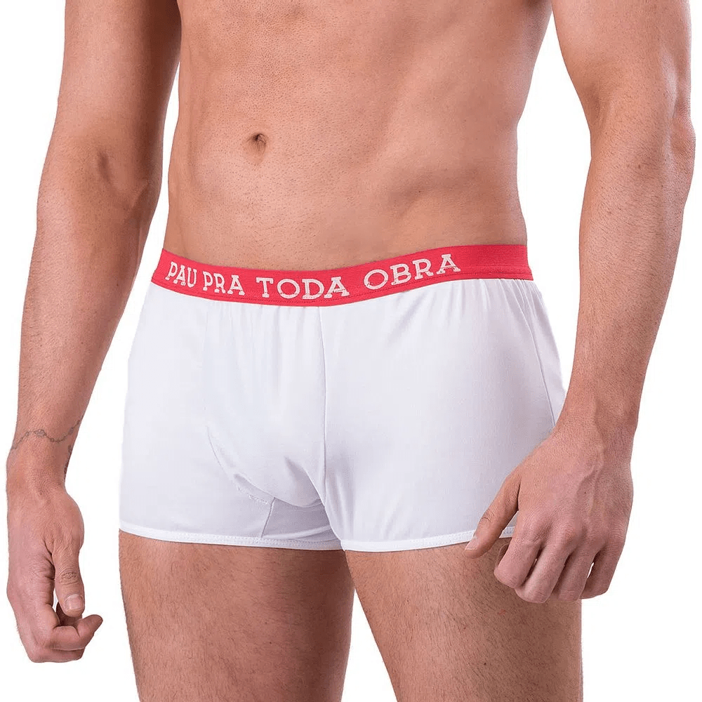 A Cueca modelo boxer é feita em tecido macio na cor branca. É ideal para fazer aquela brincadeira descontraída. O elástico na cintura garante melhor ajuste e possui a frase “Pau pra Toda Obra” estampada.
