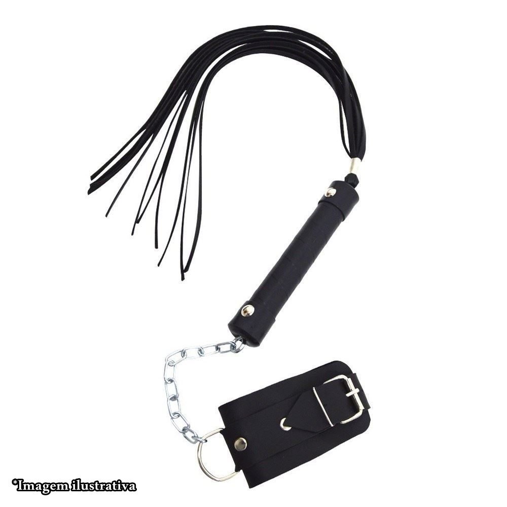 Chicote com tiras confeccionado artesanalmente em sintético semelhante à couro, resistente e flexível para proporcionar toque com impacto confortável no corpo. Bracelete confeccionado no mesmo material com revestimento interno aveludado.