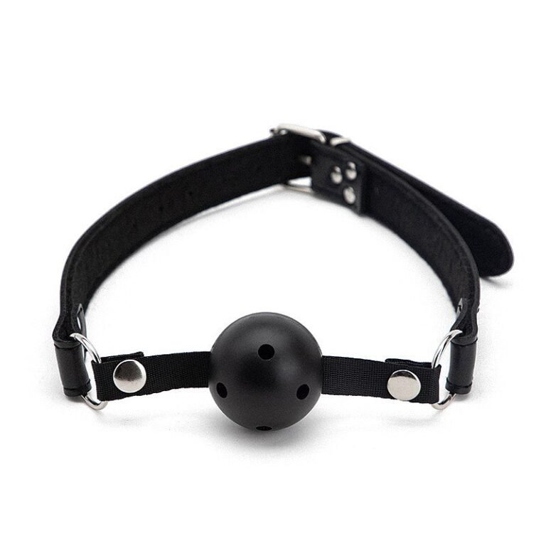Mordaça tipo bola, possui tira larga em material sintético com ajuste.