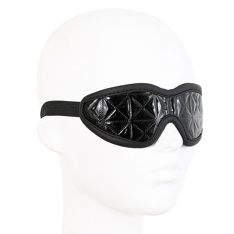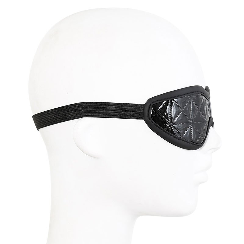 Venda para os olhos com acabamento brilhante em alto relevo, forro interno e tira ajustável.